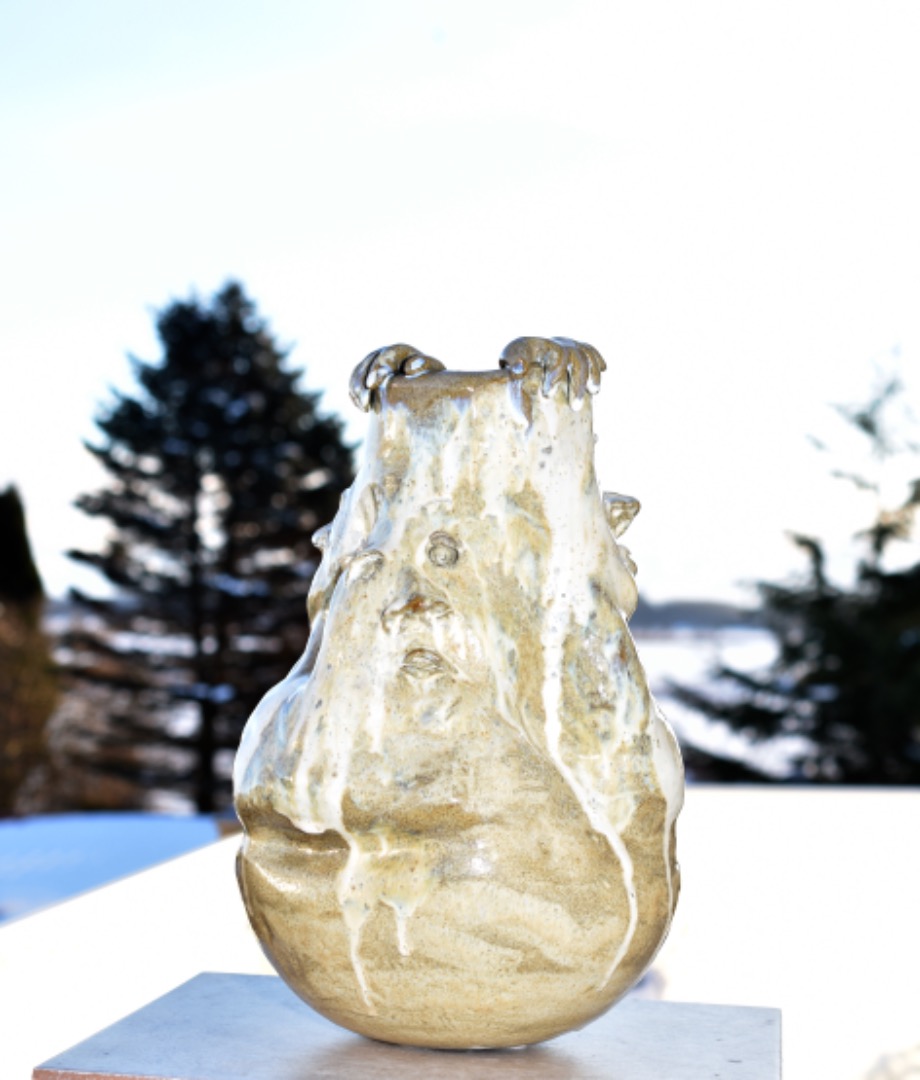 Skulpturel krukke med EDDY ansigter & hænder, Eddy der er hoppet ned i krukken.